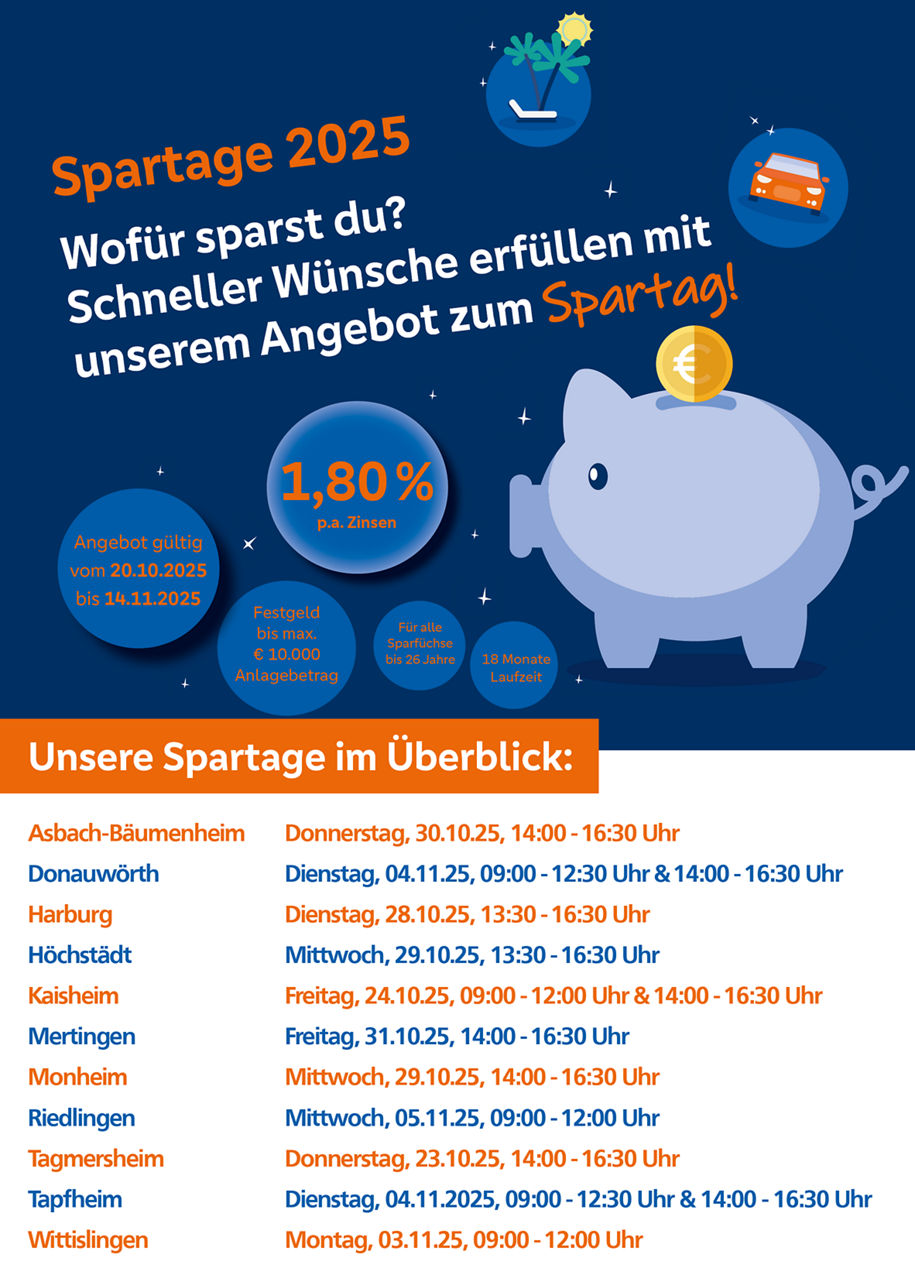 Wichtig: In unserer Geschäftsstelle Rain ist keine Spardosen-Leerung vor Ort möglich. Bitte besucht dafür unsere Geschäftsstelle in Asbach-Bäumenheim. Die Kunden der Geschäftsstelle Buchdorf bringen ihre Spardosen bitte in die Geschäftsstelle Kaisheim. Alle Infos und genauen Termine findet ihr unten im Flyer. Wir freuen uns schon riesig auf euch!